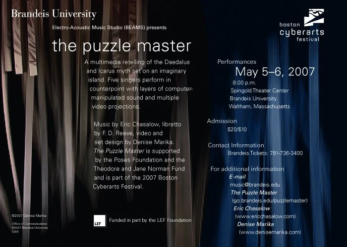 The Puzzle Master (2007), text by F.D. Reeve. One-hour opera for five singers, keyboard, electronics and video.